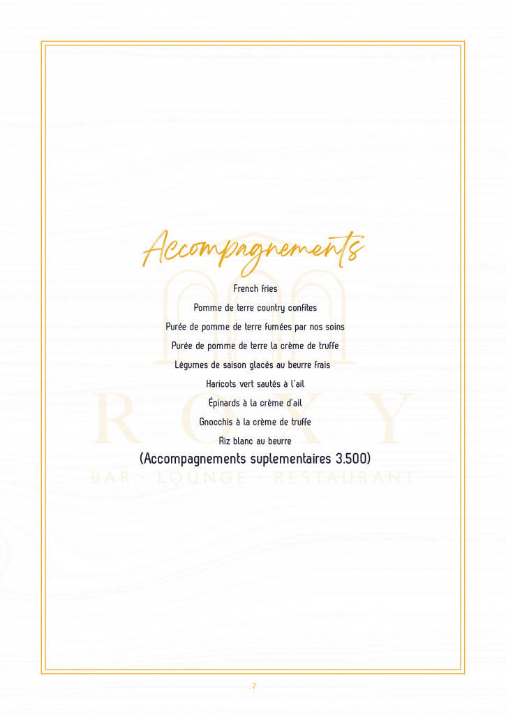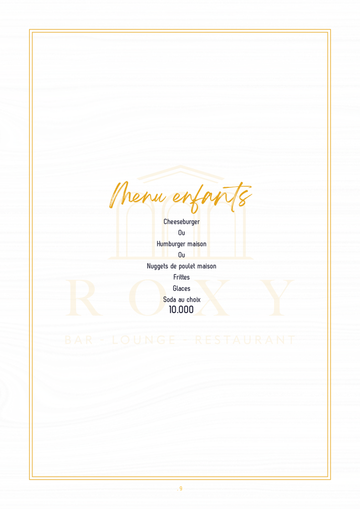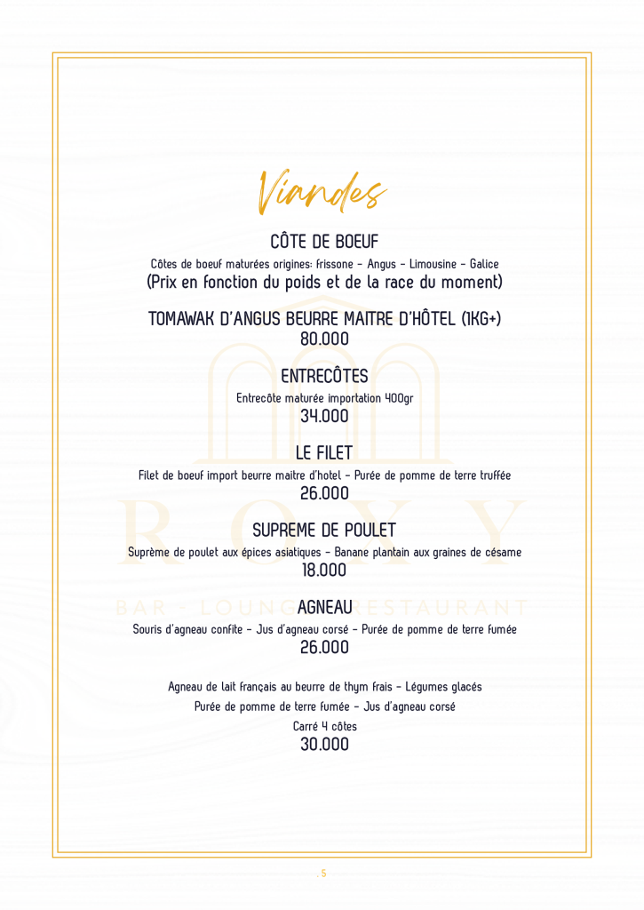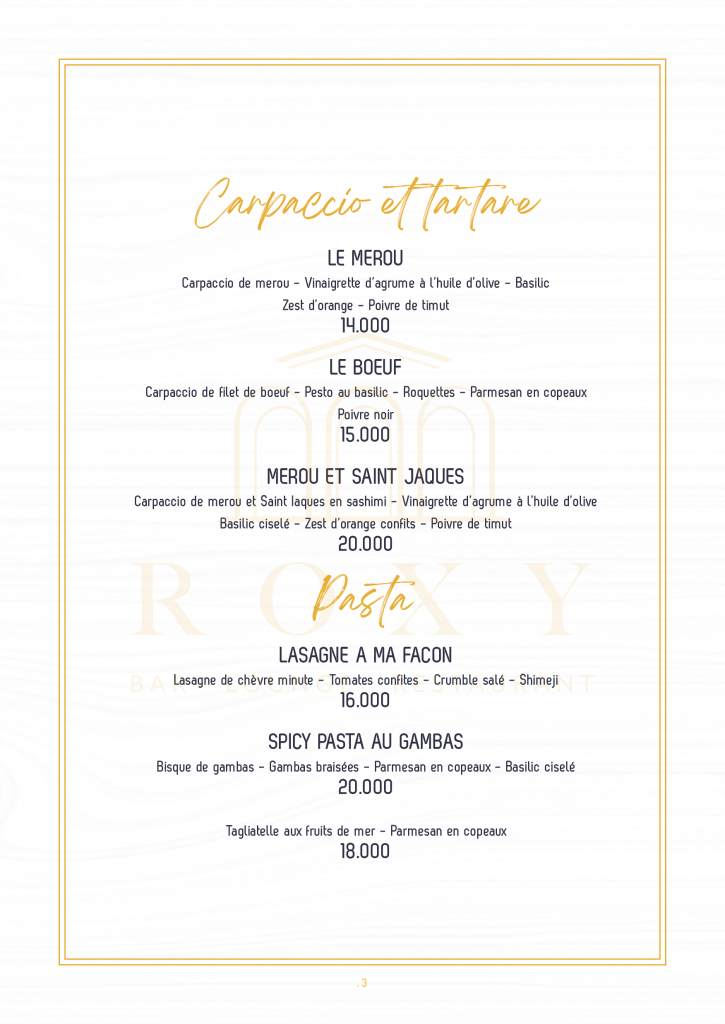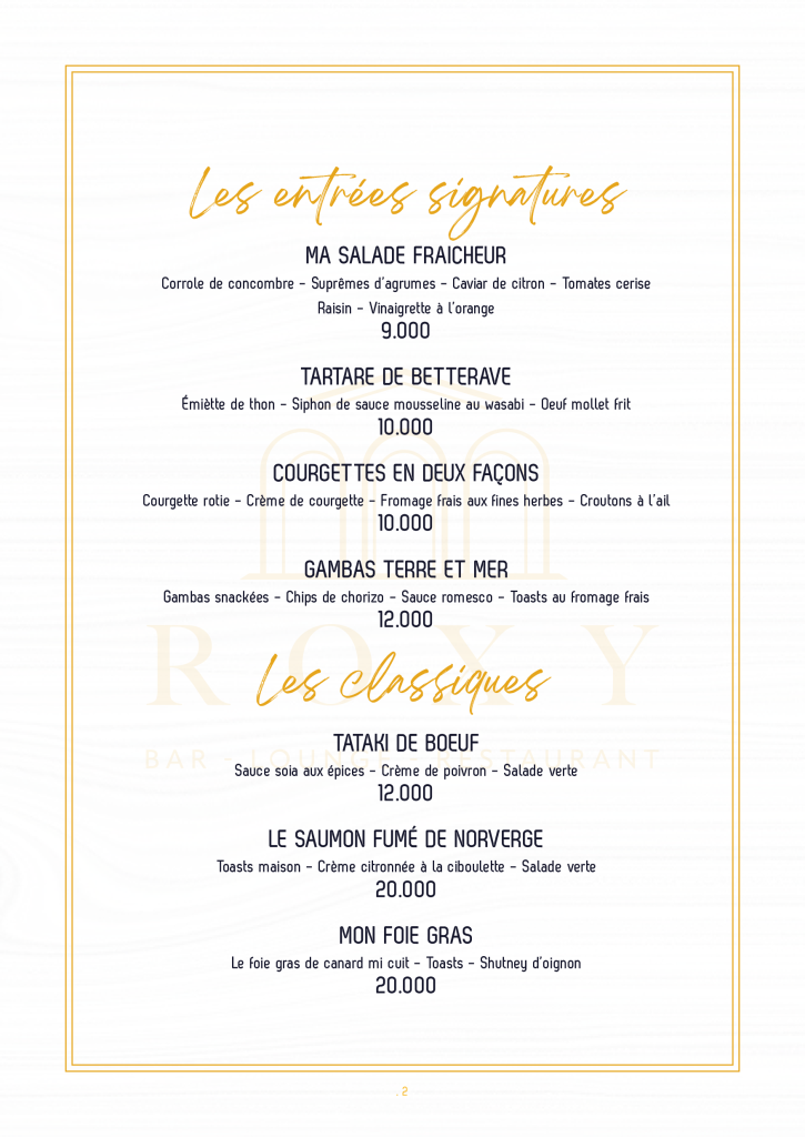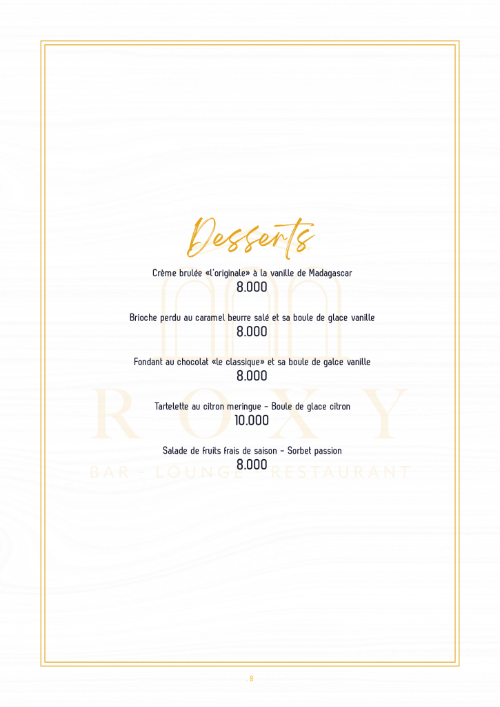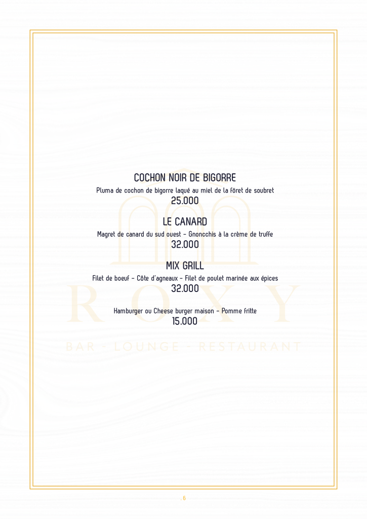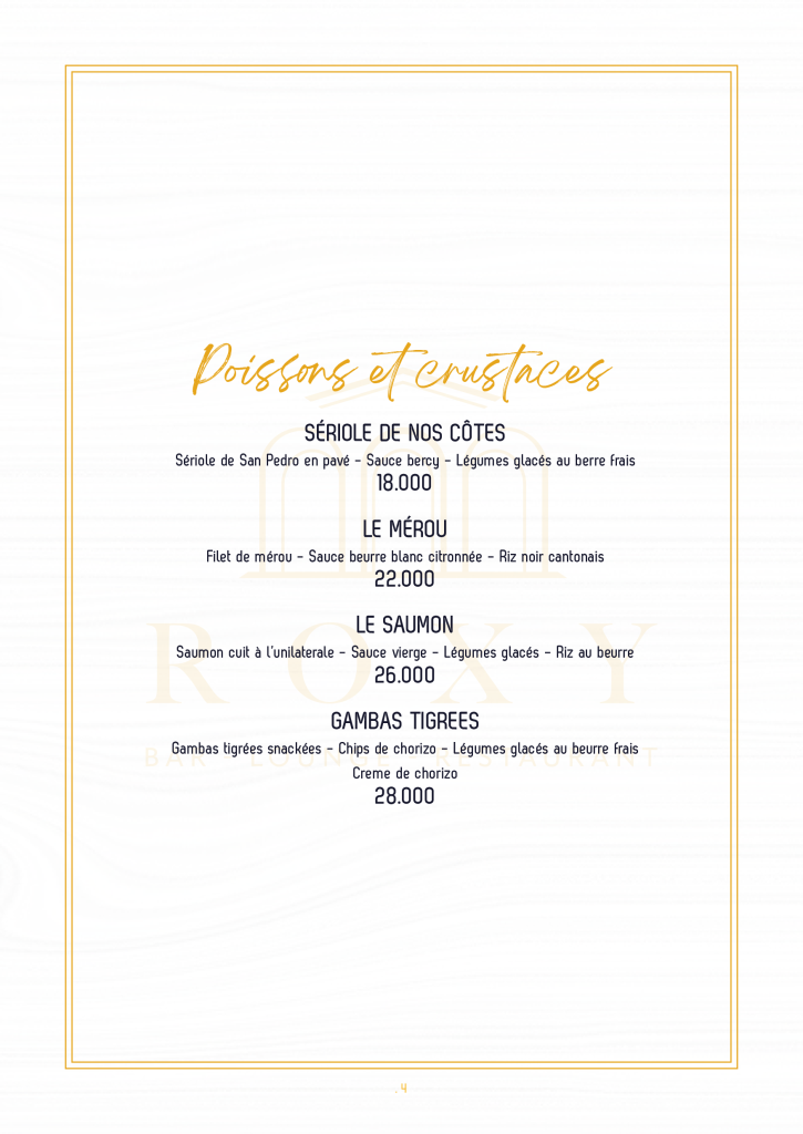La carte raffinée, met à l’honneur des produits de qualité, accompagnée d’une belle cave à vins. Le Roxy Lounge se compose de quatre espaces avec une décoration originale : un espace Habana Room dédié aux amateurs de cigares, un bar climatisé où l’on peut savourer de délicieux cocktails, un espace extérieur situé au bord de la piscine, et un espace VIP réservé au restaurant gastronomique. Dirigé par un chef passionné, le Roxy Lounge propose une cuisine française aux inspirations internationales — italienne, espagnole, thaïlandaise, jamaïcaine — sans oublier ses spécialités maison.